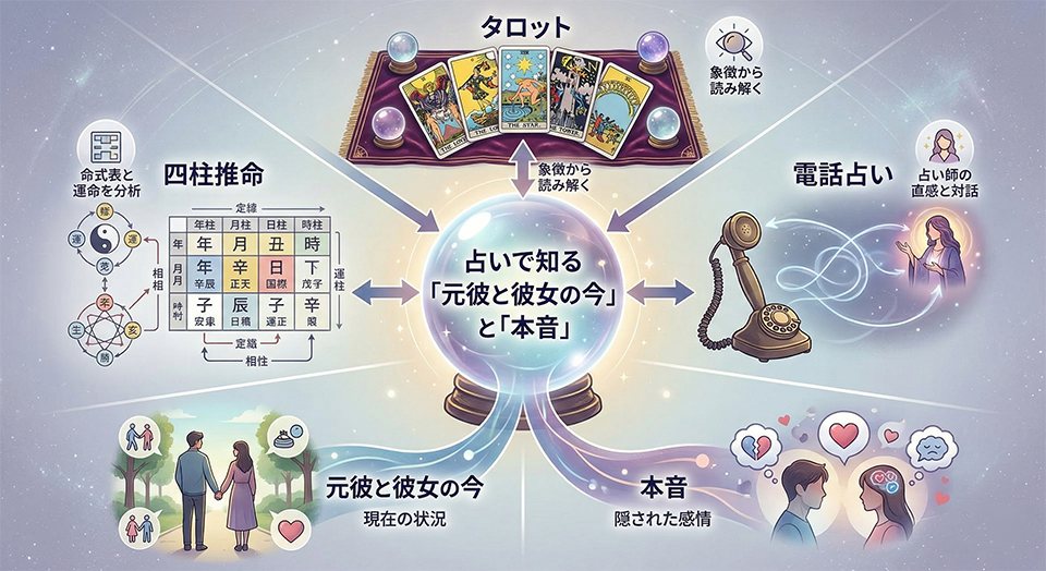 タロットや四柱推命、電話占いなどを通して、元彼と今の彼女の関係性や、あなたとのご縁を冷静に見つめ直してみることで、苦しい気持ちに区切りをつけたり、復縁への可能性を探ったりすることができます。