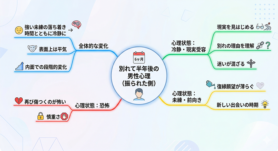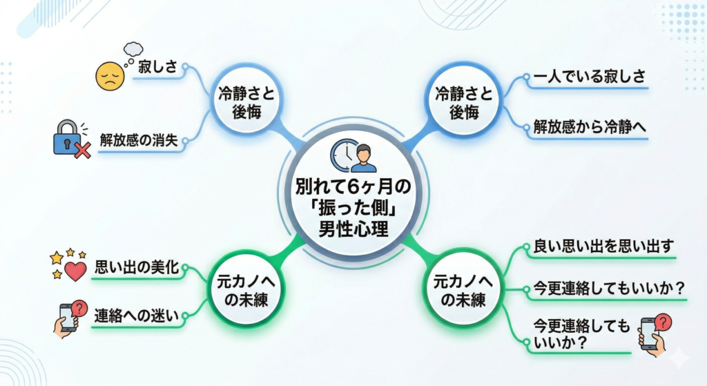 別れてから半年という時間は、男性心理が大きく変化するタイミングです。別れた直後とは違い、「解放感」だけでなく、後悔や現実も見え始める時期。