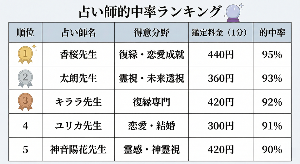 | 順位 | 占い師名 | 得意分野 | 鑑定料金(1分) | 的中率 | 今すぐ占う |